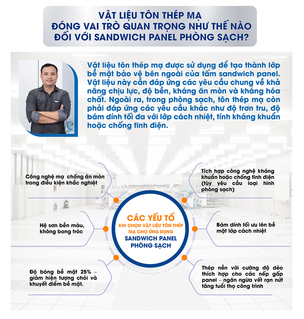 Với phòng sạch phải sử dụng panel để giữ nhiệt, tuỳ vào nhiệt độ của phòng mà quyết định độ dày của panel về lõi cũng như lớp phủ, bao che, đảm bảo sạch, tính kháng khuẩn, tính chịu bền, nhiệt độ, độ âm hoặc là khi bình thường không âm thì tấm panel sẽ bị co dãn như thế nào theo nhiệt độ.