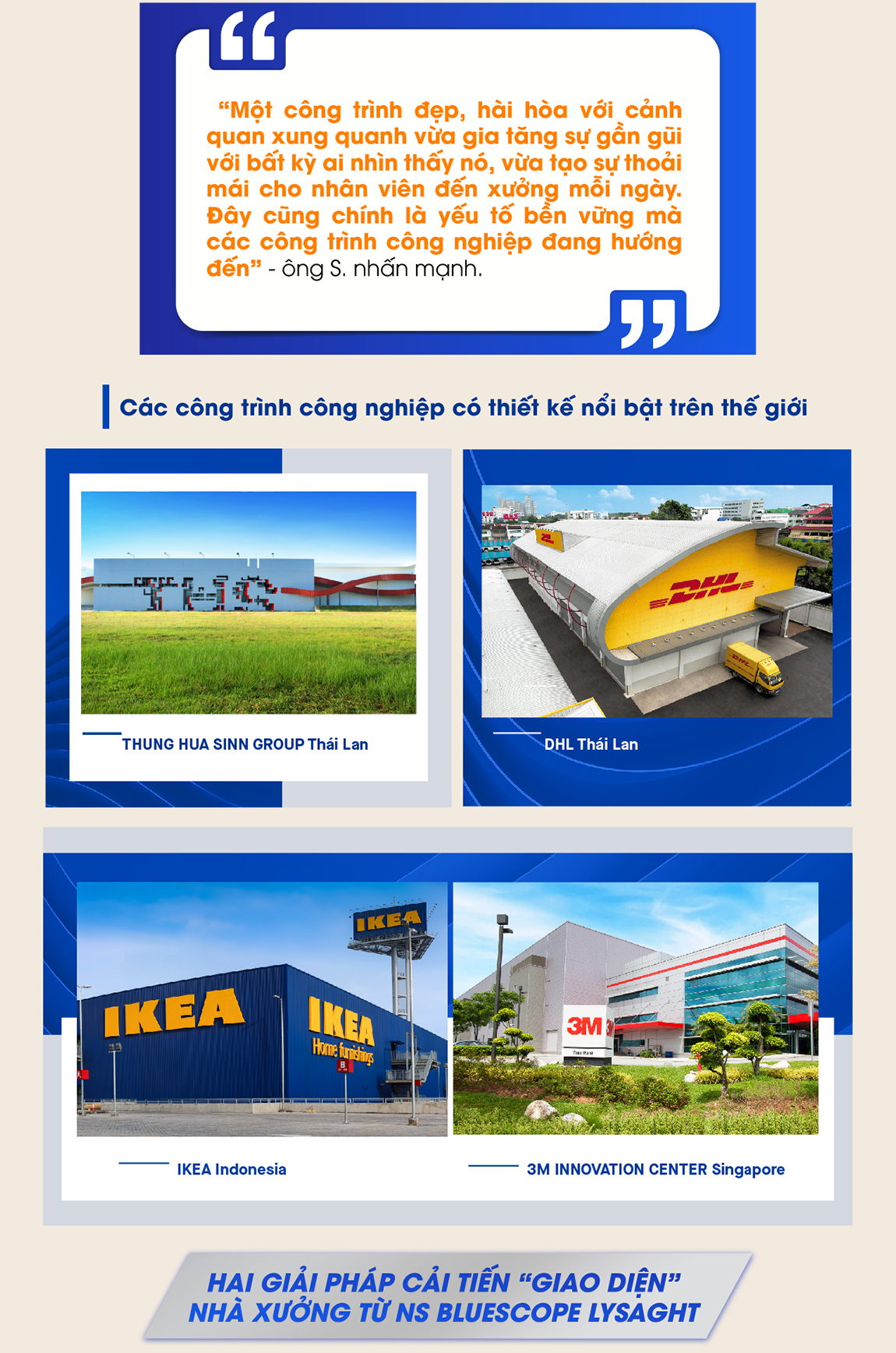 Đi đầu trong việc cung cấp các giải pháp mới về thép cho các công trình xây dựng công nghiệp, NS BlueScope Lysaght Việt Nam mang đến 2 phương án tối ưu với chi phí hợp lý, giúp nhà đầu tư cải tiến “giao diện” các công trình công nghiệp hiện có, với mức đầu tư thêm chỉ từ 5% trên tổng chi phí phần bao che.