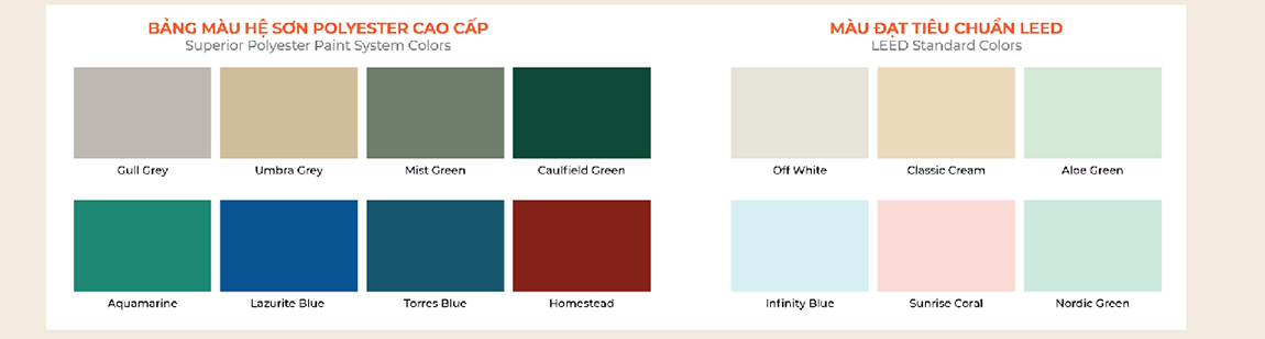 Tùy theo yêu cầu về môi trường và ứng dụng cụ thể phù hợp với dự án, BlueScope có thể cung cấp các bảng màu phi tiêu chuẩn, độ bền màu lên đến hàng chục năm, đa dạng theo nhu cầu của khách hàng.