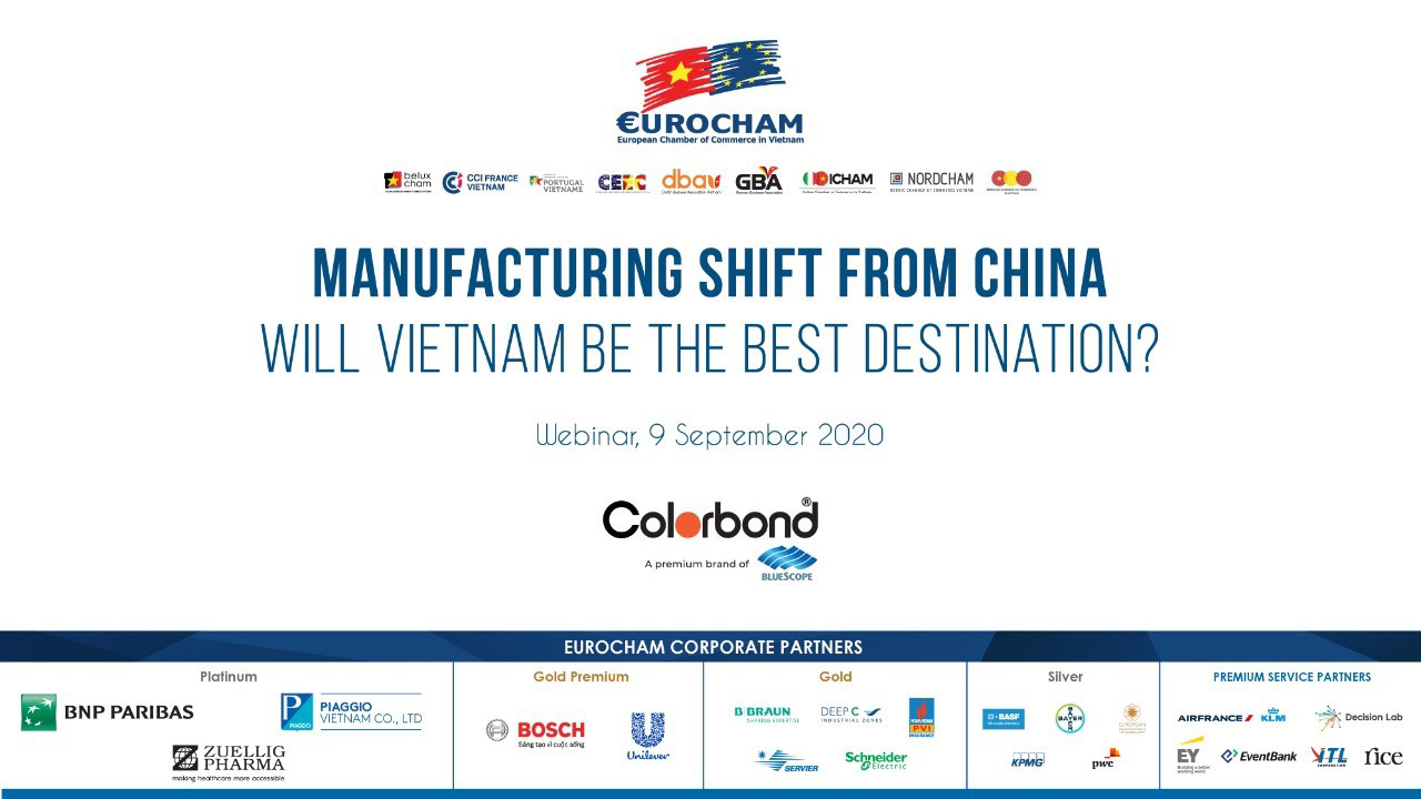 Ngày 9/9/2020 vừa qua, hội thảo trực tuyến với chủ đề “Manufacturing shift from China. Will Vietnam be the best destination?” do EUROCHAM tổ chức với sự đồng hành của Tôn COLORBOND® đã thu hút hơn 100 đại diện từ các doanh nghiệp trong lĩnh vực sản xuất tham gia.