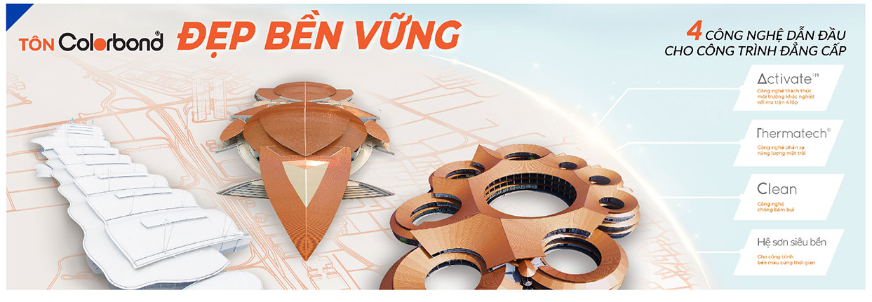 Tôn Colorbond® – với sự kết hợp hoàn hảo giữa Công nghệ và Nghệ thuật, đã khoác lên mình các công trình vẻ đẹp và sức sống trường tồn theo năm tháng, trở thành những công trình mang dấu ấn thế kỷ – cùng với 04 công nghệ dẫn đầu: