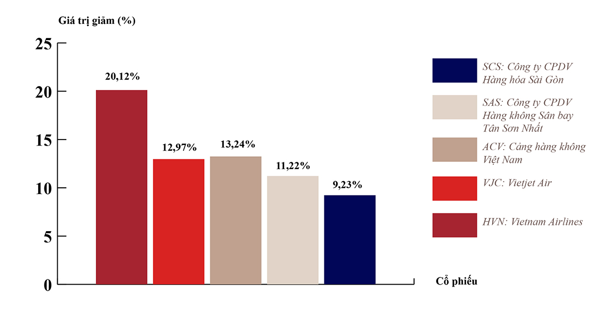 Thị trường chứng khoán cũng không khả quan hơn, chỉ từ 30/1 – 6/2 cổ phiếu HVN của Vietnam Airlines đã giảm 6.600 đồng (giảm 20,12% giá trị), tương ứng thất thoát hơn 9.300 tỷ đồng. Tương tự, cổ phiếu của Vietjet Air đã giảm 19.500 đồng (giảm 12,97% giá trị), khiến vốn hóa “bay hơi” 10.300 tỷ đồng.