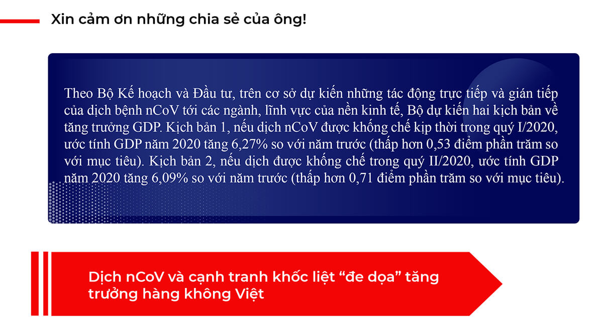 Từ những phân tích trên cho thấy, dịch nCoV vẫn đang ở “tâm bão” chưa có dấu hiệu hạ nhiệt, điều này đe dọa đến hoạt động kinh doanh của hầu hết các ngành, lĩnh vực, song song với ngành du lịch, hàng không cũng là ngành đang chịu nhiều tổn thất “cực lớn” và dự báo tình hình sẽ còn ảm đạm trong vòng 1 vài tháng tới.