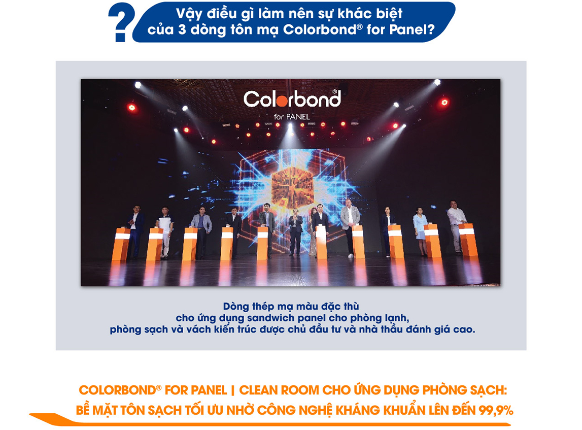 Ông Lâm Thái Bảo, Tổng Giám đốc Công ty cổ phần Công nghiệp lạnh Hưng Trí đã đánh giá: “Khi sử dụng lắp đặt cho các kho lạnh cũng như các phòng sạch, COLORBOND® for Panel giải quyết được các vấn đề trăn trở nhất của nhà thầu về rỉ sét, bám bẩn – nguyên nhân sinh ra vi khuẩn, ảnh hưởng tới sản phẩm trong kho.”