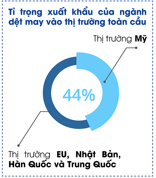 Ông Vũ Đức Giang, Chủ tịch Hiệp hội Dệt may Việt Nam (VITAS) cho biết, ngành dệt may Việt Nam hiện có 5 thị trường trọng điểm lớn. Trong đó, Mỹ là thị trường lớn nhất, chiếm tỷ trọng 44-46% tổng xuất khẩu của ngành dệt may Việt Nam vào thị trường toàn cầu. Tiếp đó là EU, Nhật Bản, Hàn Quốc và Trung Quốc.